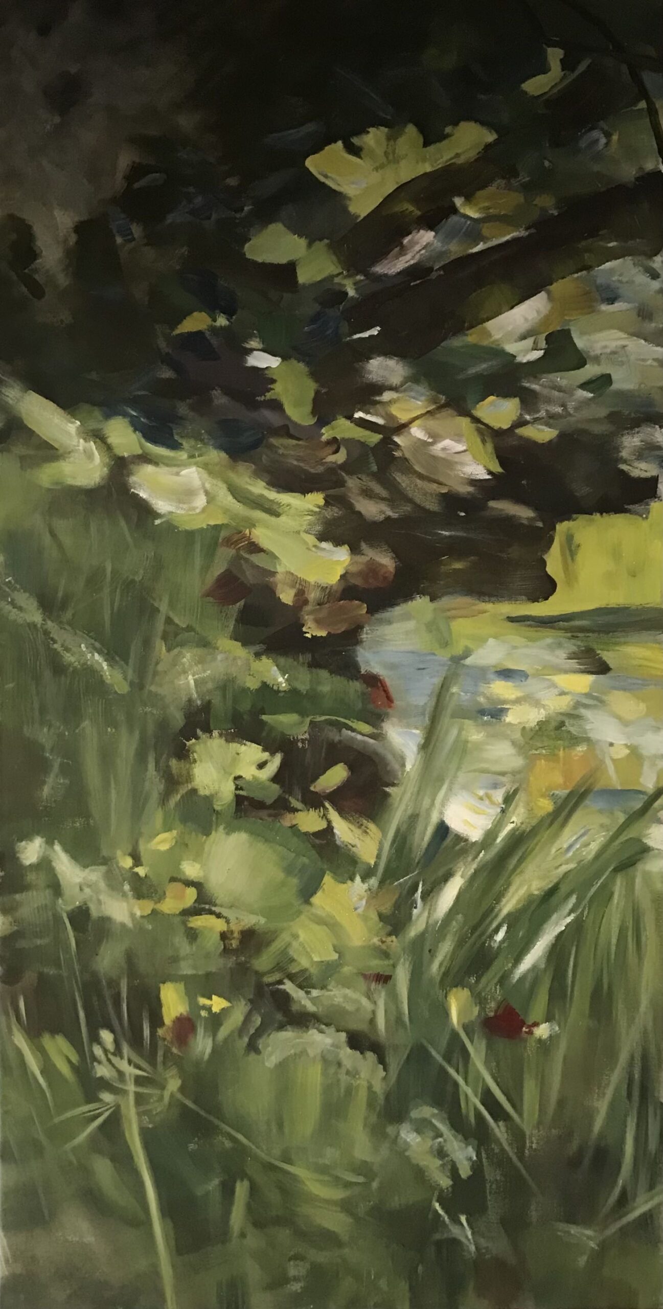 „By the Pond“, Acryl on Canvas, 180x91cm, 2021 Available to Buy